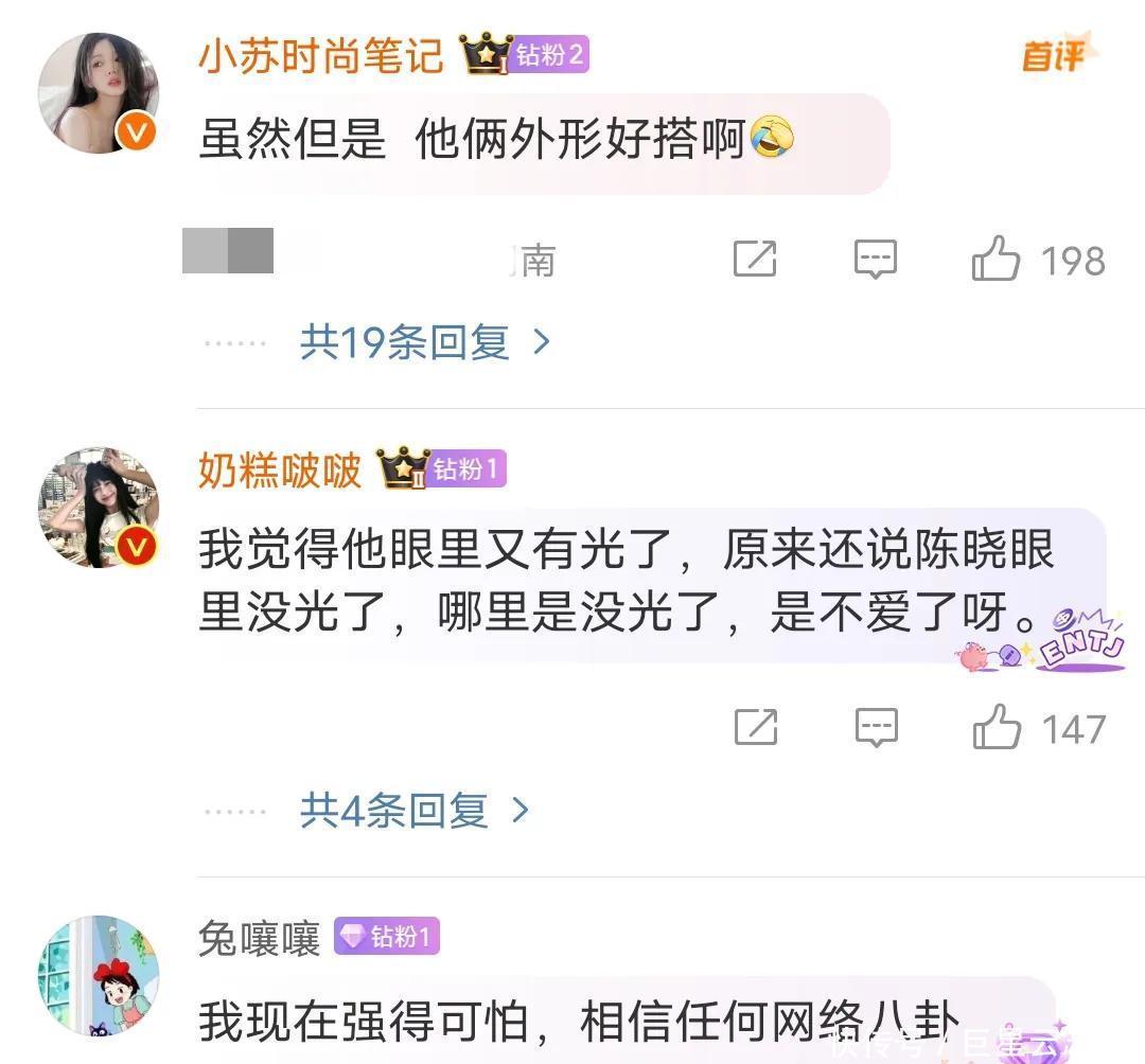 当然,两人只是合作,一同出现在公众场合宣传新剧而已,只是网友觉得比较般配,所以会有一些不切实际的遐想。很多网友表示陈晓过去不是眼里没有光了,而是没有爱了。有的甚至觉得他很真实,爱与不爱从眼神中就能看出来。有的觉得双方只是合作而已,没必要过度解读。